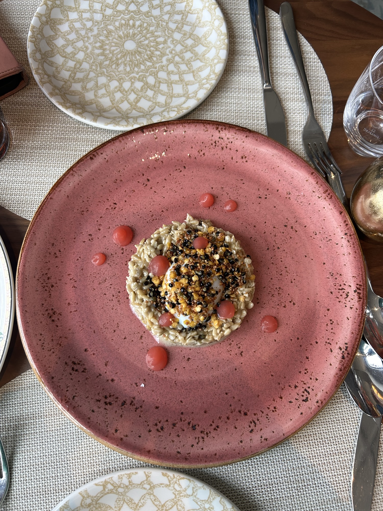 Overall, the food was amazing. My mother and I’s favorite dish was the “Risotto”, a playful twist on the classic dish which was absent of any cheese and instead had a base of sunflower seeds. Nevertheless, the texture was crunchy, creamy, and the artistic inclusion of a fruity gelatinous puree on top balanced out the dish. The Mushroom Wellington was also a delight. We both weren’t the biggest fans of the plated sauce (it was VERY mushroom heavy) but the Wellington itself was flaky and stuffed with just the right amount of mushrooms. I was surprised to not notice the absence of beef, especially because my mother and I particularly love Beef Wellington. Being the most expensive item we got, a downside to the meal was that it was a relatively small dish. Luckily, we were splitting dishes, but it would not be enough to fill most people as a dinner option. The Beef Carpaccio was nothing riveting. We neither loved nor hated it. The beef was tender and the burrata on top helped balance the meaty flavor, but the overall dish felt lacking. The service was exceptionally fast and knowledgeable, and felt experienced enough to answer a few of our questions. I can’t wait to come back.